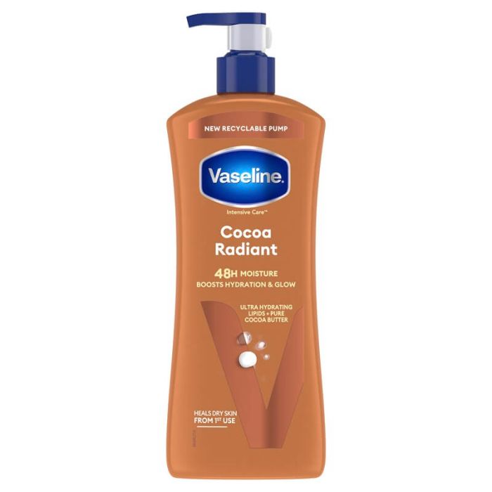 Vaseline Cocoa Lotion е създаден да хидратира и подхрани кожата на тялото. Грижи се за кожата, като поддържа оптимална влажност до 48 часа. Формулиран е с микрокапки Vaseline Jelly, които задържат влагата в кожата. Обогатен с чисто какаово масло, богато на антиоксиданти и хранителни вещества. Формулата на Вазелин Кокоа Лосион за тяло е лека, не оставя мазен филм, попива бързо и придава лек бляскав ефект. Подходящ е за суха кожа и има приятен аромат на какао. Дерматологично тестван.