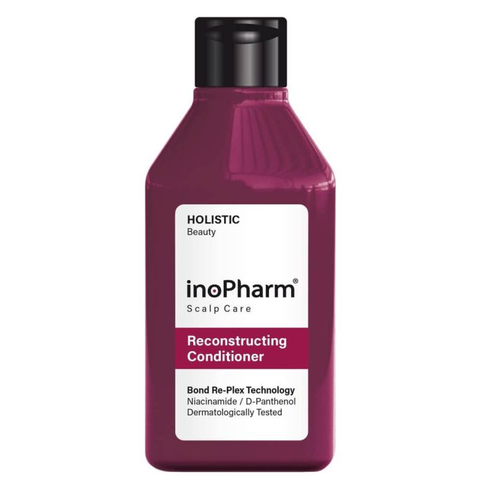 InoPharm Renu Reconstructing Conditioner Bond Re-Plex Technology e възстановяващ балсам за увредена и третирана коса. Формулата е базирана на иновативната технология Bond Re-Plex, която представлява комплекс от аминокиселини с директно действие върху кератиновите вериги и микро връзките във влакната на косъма. Намалява накъсването на косъма и значително подобрява здравината му. Експертно решение за отслабена коса, с липса на обем, жизненост и сила. Инофарм Реню Балсам за увредена и третирана коса връща живота на косата и има усъвършенстван подхранващ ефект. Допринася за по-дълготрайното запазване на цвета на боядисаната коса. Дерматологично тестван.