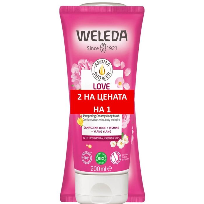 Комплектът съдържа: Weleda Love Кремообразен душ гел с аромат на роза, жасмин и иланг-иланг 200 мл 2 бр.