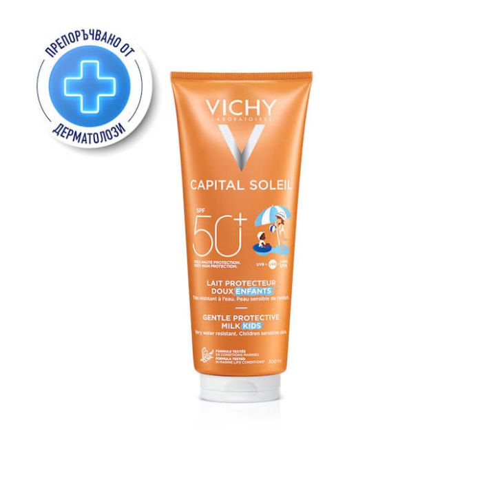 Vichy Ideal Soleil Milk for Children SPF50+ е слънцезащитно мляко за деца, което предоставя на кожата изключително висока слънцезащита, предпазвайки децата от вредните ултравиолетови лъчи. Млякото е много подходящо за деца със светла и чувствителна кожа. Специалната формула с Mexoryl®-XL, заедно с минерали, предпазва кожата от негативните влияния на UVA и UVB-лъчите и защитава клетките в дълбочина. Обогатено с термална минерализираща вода Vichy, която притежава прекрасно успокояващо, антииритативно и силно укрепващо въздействие върху кожата. Виши Идеал Солей Слънцезащитно мляко за деца SPF50+ предпазва детската кожа от слънчево изгаряне и бъдещи негативни последици. Без парабени. Продукът е тестван под дерматологичен и педиатричен контрол. Некомедогенен. Хипоалергенен.
