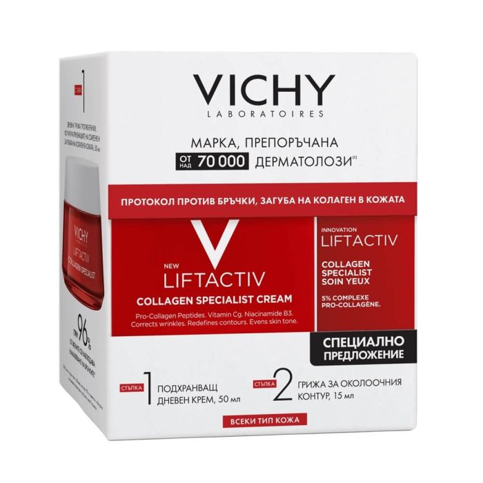 Комплектът съдържа: Vichy Liftactiv Collagen Specialist Дневен крем за лице против бръчки за всеки тип кожа 50 мл. 1 бр. + Vichy Liftactiv Collagen Specialist Околоочен крем 15 мл. 1 бр.