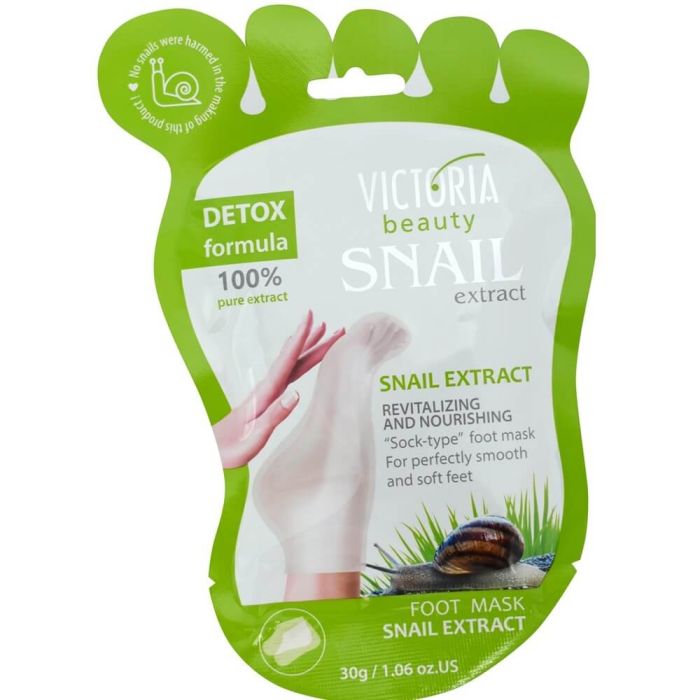 Victoria Beauty маска за крака чорап с екстракт от охлюв представлява подхранваща маска под формата на чорапки, комбинираща екстракт от охлюви и урея. Екстрактът от охлюв е богат на протеини, колаген, еластин, хиалуронова киселина и фито антибиотици. Поради богатството от съставки той има широко въздействие върху кожата. Регенерира, хидратира, подхранва, възстановява и оказва добър ефект за оптимално доброто състояние на кожата. Добавената във формулата урея засилва ефекта на омекотяване и изглаждане на кожата. Стъпалата стават гладки, зоните в който обичайно кожата се втвърдява се омекотяват, напукванията на кожата изчезват. Използването на Виктория бюти маска чорап за крака с екстракт от охлюв има омекотяващ, изглаждащ и освежаващ ефект.