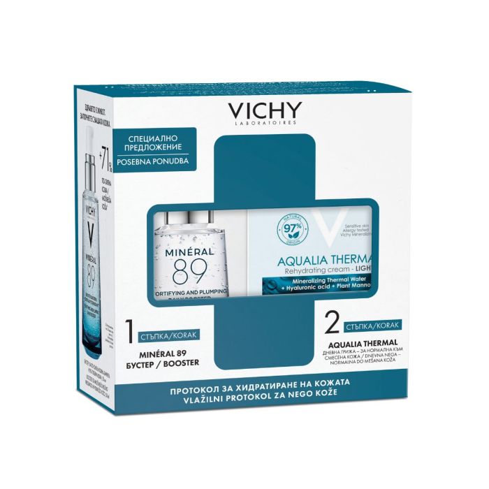 Комплектът съдържа: Vichy Aqualia Thermal Хидратиращ крем за лице лека текстура 50 мл 1 бр + Vichy Mineral 89 Хидратиращ гел-бустер 50 мл 1 бр