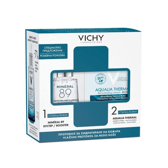Комплектът съдържа: Vichy Aqualia Thermal Хидратиращ крем за лице с богата текстура 50 мл 1 бр + Vichy Mineral 89 Укрепващ и хидратиращ гел-бустер 50 мл 1 бр