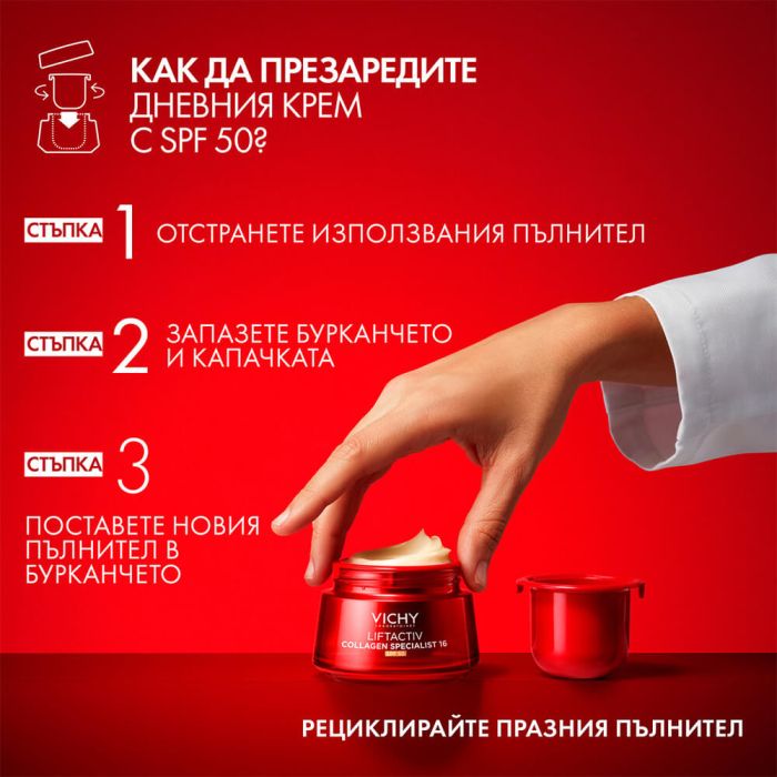 Vichy Liftactiv Collagen Specialist 16 SPF50 Сream Refill е формула с двойно действие, комбинираща слънцезащита с анти-ейдж ефект. Специалната Co-bonding* технология [рамноза+пептиди+майтаке] активира и спомага свързването на групи колаген. Коригира 16 признака на стареенето. Специалната формула е обогатена с едни от най-силните дерматологични съставки от естествен произход, включително 16 типа колаген, които се свързват помежду си, засилват плътността и придават сила на кожата. Допринася за изглаждане на бръчки, фини линии, стяга отпусната кожа. Подобрява текстурата, придава сияние, мекота, изравнява тена. Виши Лифтактив Колаген Спешълист 16 Крем против бръчки пълнител има положителен ефект за рескулптурирането на контура. Продуктът има лека, кадифена текстура, която попива бързо. Без парабени. Дерматологично тестван продукт. Некомедогенен. Хипоалергенен.