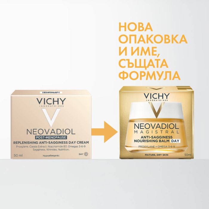 Vichy Neovadiol Menopause Day Cream for very dry skin е подхранващ дневен крем за лице, който помага за компенсиране въздействието на менопаузата върху външния вид на кожата. Предназначен за много суха кожа в постменопаузата. Специалната формула съдържа уникална комбинация от активни съставки - вулканична вода Vichy, 1% Proxylane с противостареещо действие, Omega киселини 3-6-9, екстракт от семена на сена и 4% ниацинамид. Виши Неовадиол Дневен подхранващ крем за много суха кожа в менопаузата стяга кожата и намалява бръчките. Без парабени. Дерматологично тестван продукт. Хипоалергенен.