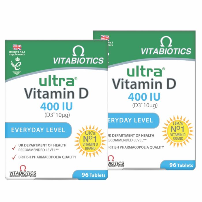 Комплектът съдържа: Ultra Витамин D3 за здрави кости и зъби x 96 таблетки Vitabiotics 2 бр.