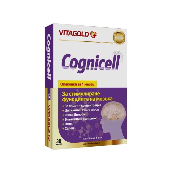 Vitagold Cognicell х30 капсули е хранителна добавка, която подпомага мозъчната функция. Подобрява мисловната дейност, увеличава обхвата на внимание, повишава концентрацията и способността за запомняне. Значителен благоприятен ефект при мозъчни травми.