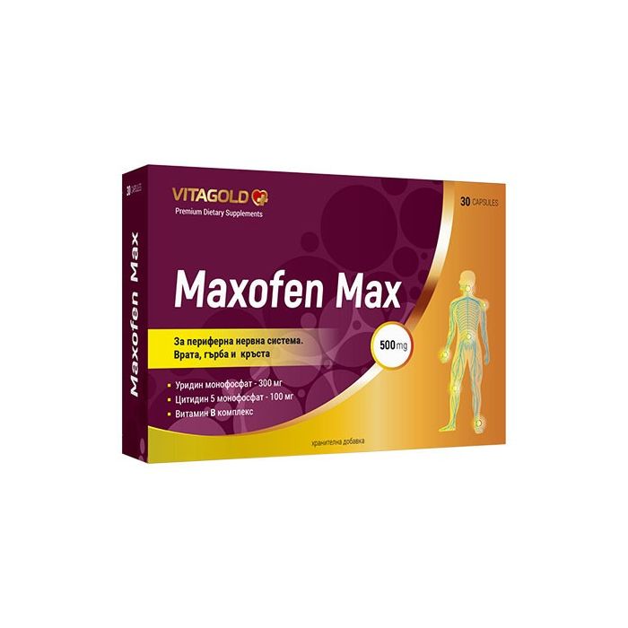 Vitagold Maxofen Max представлява комплексна формула, съчетаваща два основни нуклеотида: уридин монофосфат и цитидин-5-монофосфат, заедно с пълния спектър витамини от В-групата. Подпомага дейността на периферната нервна система, като насърчава възстановяването на увредените нервни влакна и стимулира процесите на ремиелинизация. Особено ефективен е при състояния като невралгии, радикулопатии и продължителни болки в опорно-двигателния апарат, където подпомага регенерацията на тъканите. Нуклеотидите играят ролята на ключов структурен елемент за изграждането на невроналните мембрани и миелиновите обвивки, докато витамините от В-комплекса подобряват нервната проводимост, подпомагат енергийния метаболизъм на клетките и допринасят за облекчаване на симптоми като изтръпване, парене и болка. Комбинираното действие на съставките на Витаголд Максофен Макс за периферната нервна система осигурява целенасочена подкрепа при функционални нарушения на нервната система, дегенеративни изменения, дискомфорт в мускулите и ставите, както и в периоди на възстановяване след физическо натоварване или неврологични увреждания.