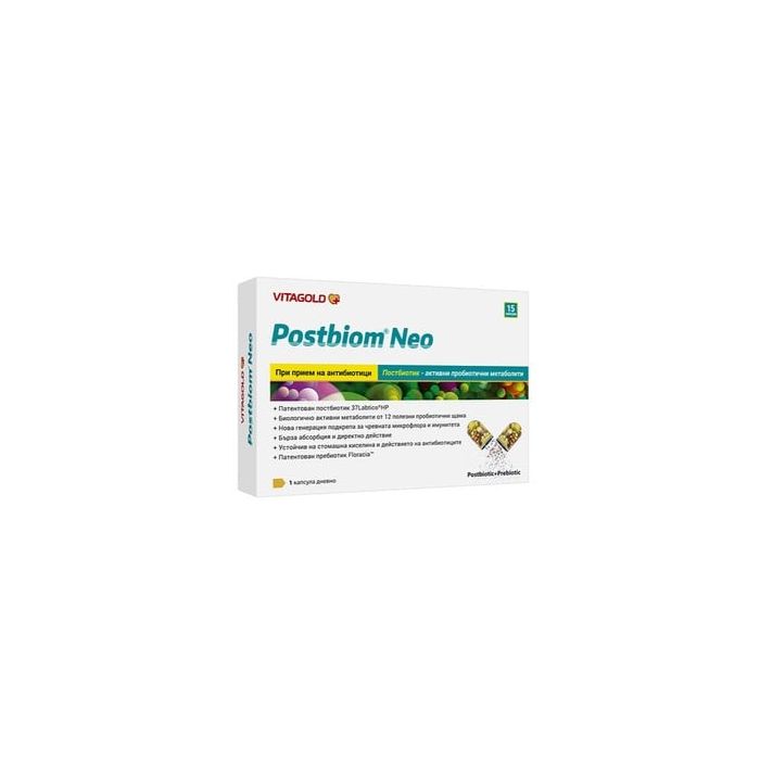 Vitagold Postbiom Neo е постбиотик, който подкрепя стомашно-чревния тракт и имунитета. Допринася за балансирането на чревната микрофлора. Формулата комбинира патентования постбиотик 37 Labtico HP с 12 щама млечно-кисели бактерии и патентования пребиотик Floracia. Подходящ е по време и след прием на антибиотици, нормализира чревната перисталтика и подпомага облекчаването на диария и запек. Витаголд Постбиом Нео намалява подуването и тежестта в стомаха.