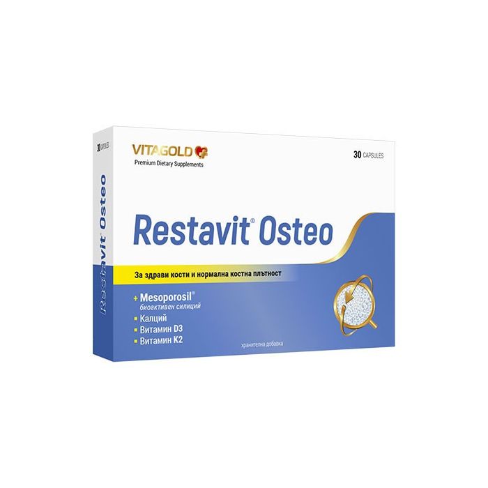 Vitagold Restavit Osteo е формула, която комбинира най-важните кофактори за костния метаболизъм: калций, витамин D3, витамин K2, витамин C и силиций. Насочена е към укрепване на костната структура. Витаголд Реставит Остео спомага при остеопения, остеопороза, загуба на костна плътност, забавено костно възстановяване и повишен риск от фрактури.