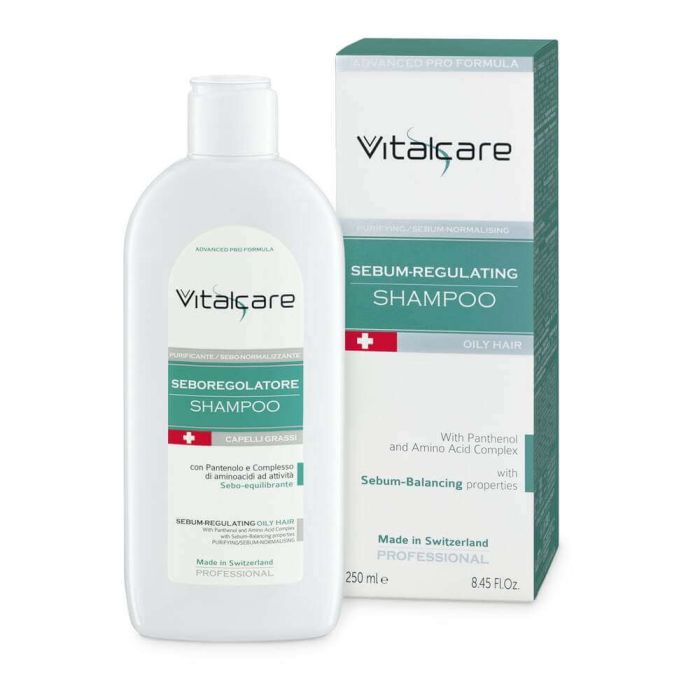 Vitalcare Swiss Sebum-Regulating Shampoo e себорегулиращ шампоан с D-Panthenol, специално разработен за лечение на мазна коса и скалп. Богат състав с Аминокиселин комплекс (Amino acid Complex) и растителен екстракт от Коприва за нормализиране производството на себум. Неговата изключителна формула създадена да регулира секрецията на скалпа и дълбоко да почиства кожата, като оставя косата деликатно ароматна и чиста. ВиталКеър Суис Себорегулиращ шампоан за мазна коса свойства: себорегулиращи, почистващи, нормализиращи производството на себум свойства. Дерматологично тестван продукт.