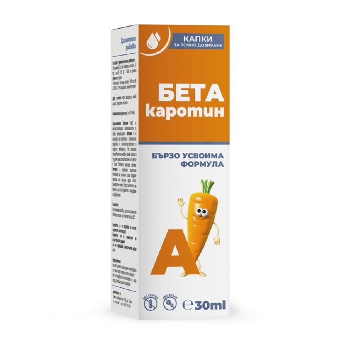 Omega Vita Бета каротин Витамин А на капки представлява хранителна добавка с бързо усвоима формула, която подкрепя защитните механизми на организма срещу вредните фактори на околната среда. Омега Вита Бета каротин Витамин А на капки влияе благоприятно върху състоянието на кожата. Съдейства за по-бързо придобиване на тен при излагане на слънце и я защитава от UV лъчите. Бета-каротинът оказва положително въздействие върху зрението.