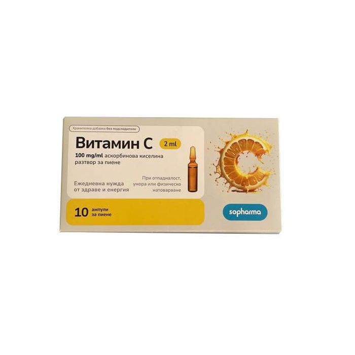 Vitamin C Ampoules Sopharma е висококачествена хранителна добавка, съдържаща витамин Ц - водно - разтворим витамин, който участва в много жизнено-важни процеси в организма. Витамин С aмпули за пиене за висок имунитет 10 бр 2 мл Софарма спомага за преодоляване на недостиг на аскорбинова киселина и произтичащите от това проблеми като мускулна слабост, оток и кръвоизливи от венците, подкожни кръвоизливи, чувство на умора, потиснатост. Vitamin C се отличава с антиоксидантно и общоукрепващо действие, стимулира имунната система и защитава организма от вирусни и бактериални инфекции, укрепва съдовете и спомага за намаляване риска от възникване на сърдечно-съдови проблеми. Витамин Ц благоприятстват още зрението, кожата, ноктите, мускулите, ставите и костите и подпомага по-бързото възстановяване след боледуване, физическо и психическо натоварване.