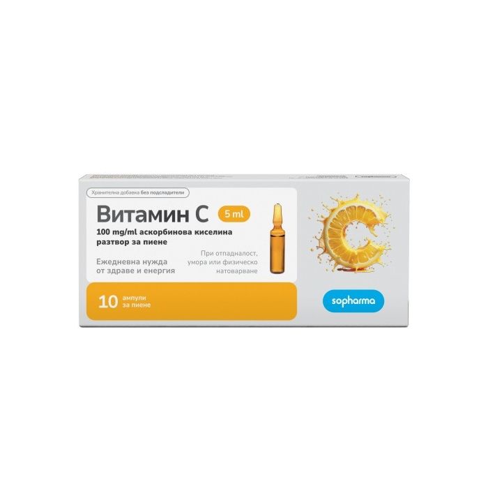 Vitamin C Ampoules Sopharma е висококачествена хранителна добавка, съдържаща витамин Ц - водно - разтворим витамин, който участва в много жизнено-важни процеси в организма. Витамин С aмпули за пиене за висок имунитет 10 бр 5 мл Софарма спомага за преодоляване на недостиг на аскорбинова киселина и произтичащите от това проблеми като мускулна слабост, оток и кръвоизливи от венците, подкожни кръвоизливи, чувство на умора, потиснатост. Vitamin C се отличава с антиоксидантно и общоукрепващо действие, стимулира имунната система и защитава организма от вирусни и бактериални инфекции, укрепва съдовете и спомага за намаляване риска от възникване на сърдечно-съдови проблеми. Витамин Ц благоприятстват още зрението, кожата, ноктите, мускулите, ставите и костите и подпомага по-бързото възстановяване след боледуване, физическо и психическо натоварване.