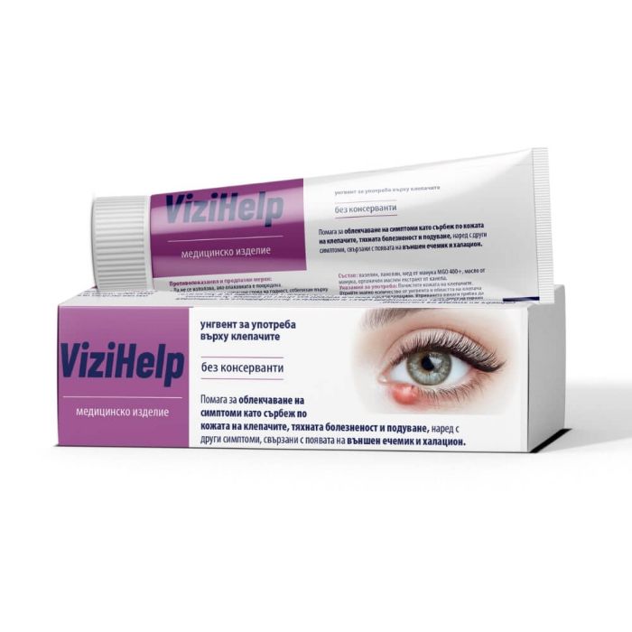 ViziHelp Унгвент при ечемик е иновативна растителна формула с мед от манука, масло от манука и екстракт от кора на канела, която успокоява раздразнението, хидратира и подпомага регенерацията на кожната бариера на клепачите. ВизиХелп Унгвент при ечемик облекчава симптомите при външен ечемик и халацион: