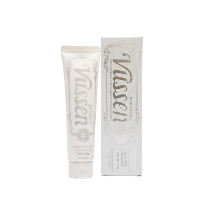 Vussen H Whitening Toothpaste е избелваща паста за зъби, която осигурява ефективно почистване и видимо избелване, като същевременно се грижи за зъбния емайл. Формулата помага за премахване на петна, освежава дъха и подпомага защитата на зъбите при ежедневна употреба. Вуссен Н Избелваща паста за зъби с грижа за емайл с хидроксиапатит 5% е подходяща за хора, които търсят комбинация от избелване и нежна грижа за емайла.