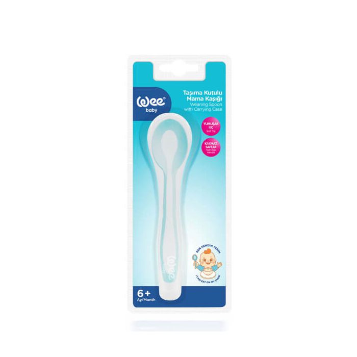 WEE BABY Weaning Spoon With Carrying Case e мека лъжичка, подходяща за бебета на 6 месеца и повече. Дръжката и върхът на лъжицата са меки.