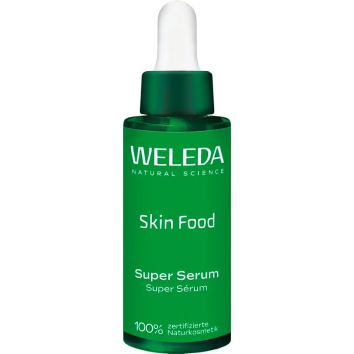 Weleda Skin Food Super Serum е хидратиращ серум с лека формула, която комбинира хиалуронова киселина, серамиди и натурални растителни екстракти. Създаден да осигури интензивна хидратация, да озари тена и да възстанови естествения блясък на кожата. Базиран на Skin Food Phyto Infusion с 100% натурални екстракти от розмарин, лайка, невен и теменужка, Веледа Скин Фуд Супер серум подхранва, освежава и успокоява кожата, като подпомага нейния баланс и жизненост.