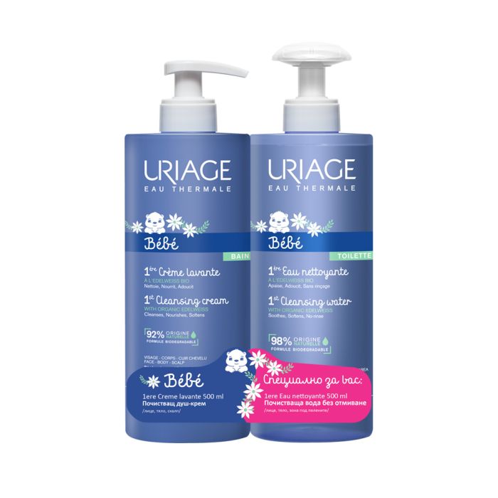 Комплектът съдържа: Uriage Bebe 1er Нежен пенлив душ-крем за бебета и деца за лице, тяло и коса 500 мл 1 бр + Подарък: Uriage Bebe 1er EAU Почистваща вода за бебета без изплакване 500 мл 1 бр.