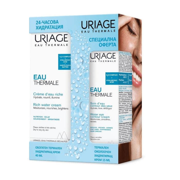 Комплектът съдържа: Uriage Eau Thermale Обогатен термален хидратиращ крем за суха кожа 40 мл. 1 бр. + Uriage Eau Thermale Термален хидратиращ околоочен крем 15 мл. 1 бр.