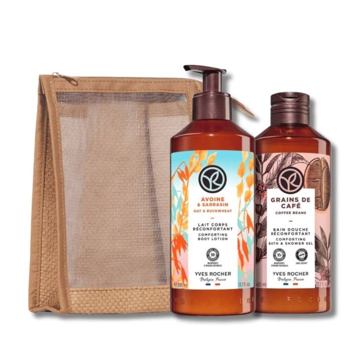Комплектът съдържа: Yves Rocher Bain Nature Душ гел кафе 400 мл 1 бр + Yves Rocher Bain Nature Мляко за тяло Овесено мляко и елда 390 мл 1 бр + Подарък: несесер 1 бр.