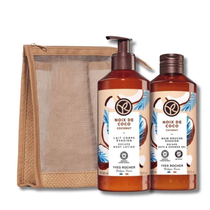 Комплектът съдържа: Yves Rocher Bain Nature Душ гел кокос 400 мл 1 бр + Yves Rocher Ben Nature Мляко за тяло кокос 390 мл 1 бр + Подарък: несесер 1 бр.