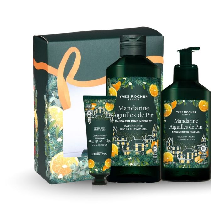 Комплектът съдържа: Yves Rocher Mandarine Aiguilles de Pin Душ гел Мандарина и борови иглички 400 мл 1 бр + Yves Rocher Mandarine Aiguilles de Pin Течен сапун Мандарина и борови иглички 190 мл 1 бр + Yves Rocher Mandarine Aiguilles de Pin Крем за ръце Мандарина и борови иглички 30 мл 1 бр.