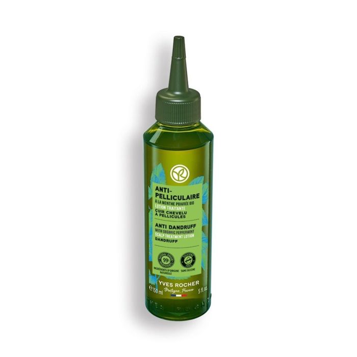 Yves Rocher Anti-Pelliculaire е лека формула, създадена за успокояване на чувствителния скалп и ефективно намаляване на лющенето още след първото приложение. Формулата, обогатена с органично мента от La Gacilly, освежава и благоприятства комфорта на скалпа, като действа против повторния появен пърхот. Ив Роше Лосион против пърхот не лепне, не омазнява, с 99% натурален състав.