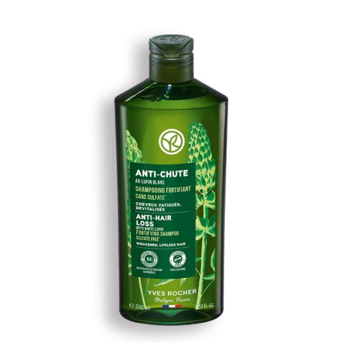 Yves Rocher Anti hair loss Fortifying Shampoo Sulfate free е нежно почиства и укрепва скалпа, като възвръща жизнеността и плътността на косата. Специално създаден за коса, склонна към изтъняване и косопад, формулиран с екстракт от бяла лупина и органичен сок от агаве, стимулира растежа на косата и подсилва корените, като прави косата по-силна и обемна. Ив Роше Анти хеър лос Шампоан против косопад е без силикони, с над 98 % съставки от естествен произход, с растителна основа. Той щади косъма и скалпа, като осигурява дълготрайна грижа. Леката гелообразна текстура създава мека и кремообразна пяна, оставяйки усещане за свежест и чистота след всяко измиване. Подходящ е за редовна употреба при слаба, безжизнена или увредена коса, нуждаеща се от видимо подсилване и поддържане на здрав вид.