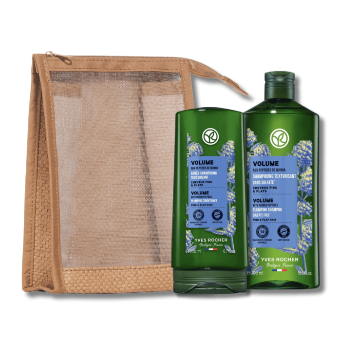 Комплектът съдържа: Yves Rocher Volume Шампоан за обем 300 мл 1 бр + Yves Rocher Volume Балсам за обем 200 мл 1 бр + Подарък: несесер 1 бр.