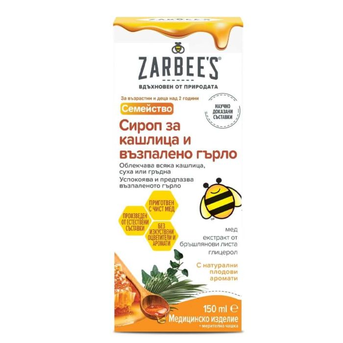 Zarbee’s Сироп за лечение на кашлица и възпалено гърло е медицинско изделие Клас IIa, което помага за облекчаване на всяка суха или гръдна кашлица и успокоява и защитава гърлото. Зарбис Сироп за лечение на кашлица и възпалено гърло съдържа мед, глицерол и екстракт от листа на бръшлян.