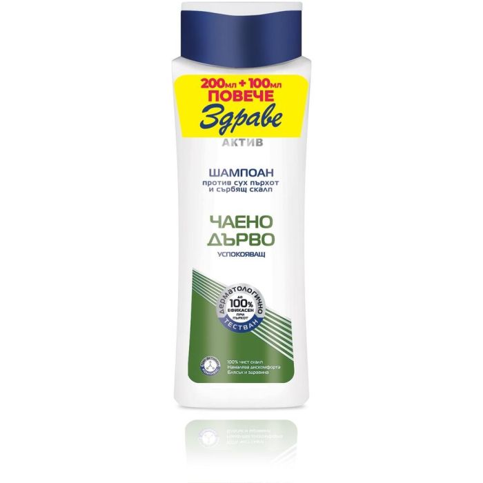 Здраве Актив Шампоан против пърхот за сърбящ скалп с чаено дърво е продукт за ефективна грижа за косата и кожата на скалпа. Създаден е с цел да успокои раздразнената кожа на главата и да премахне пърхота. Шампоанът е подходящ при сух пърхот. Той почиства, тонизира, намалява възпаленията и съпътстващия дискомфорт. Съдържа масло от чаено дърво, което облекчава сърбежа. Маслото е известно със своите противогъбични и антибактериални свойства. В състава на шампоана се включва мощен комплекс от три съставки, които взаимно допълват своето действие - Zinc pyrithione, Alkyl lactate и Panthenol. Комплексът има широкоспектърно действие срещу гъбичките, причиняващи пърхот, като ограничава растежа им. Съставките премахват пърхота от кожата на главата и косата, имат овлажняващо, успокояващо и възстановяващо действие. Здраве Актив Шампоан против пърхот за сърбящ скалп с чаено дърво e подходящ за честа употреба. Дерматологично тестван.