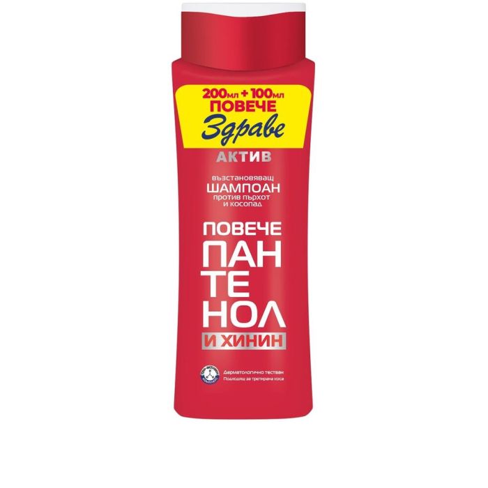 Здраве Актив Шампоан за коса с пантенол и хинин съдържа иновативен три-активен комплекс, съставен от взаимнодопълващи действието си съставки, които осигуряват широкоспектърно противогъбично действие при борба с пърхота. Комплексът ефективно премахва пърхота от скалпа, потиска растежа на гъбичките, които го причиняват, почиства и освежава кожата на главата. В резултат успокоява и овлажнява скалпа, като намалява раздразненията и дискомфорта. Кората на хининово дърво е ефикасна срещу косопад, като подобрява мокроциркулацията и стимулира метаболизма на клетките на скалпа и луковицата на косъма. Пантенолът стимулира регенерацията на клетките, увеличава силата на колагеновите влакна и придава здрав и свеж вид на косата и кожата на скалпа. Комбинираното действие на хинина и пантенола благоприятстват: