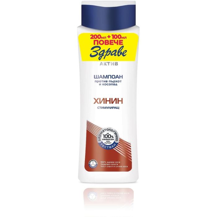 Здраве Актив Стимулиращ шампоан против пърхот и косопад с хинин е продукт за грижа за косата, който я подсилва и подпомага растежа ѝ. Има изразено противопърхотно действие. Облекчава сърбежа. Здраве Актив Стимулиращ шампоан против пърхот и косопад с хинин e подходящ за всеки тип коса. Шампоанът съдържа специално подбрана комбинация от три активни съставки, които успешно премахват пърхота, като контролират растежа на гъбичките, виновни за появата му. Тези съставки са: Zinc pyrithione, Alkyl lactate и Panthenol. Те почистват, овлажняват и освежават. Косата става по-мека, здрава и еластична. Кожата на скалпа се успокоява, намалява се дискомфорта, причинен от раздразненията. В състава на шампоана е включен екстракт от кората на хининово дърво, който заздравява косата, стимулира растежа ѝ, като подобрява микроциркулацията и метаболизма на клетките на скалпа и лукувиците на косъма. Дерматологично тестван.