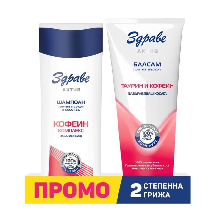 Комплектът съдържа: Здраве Актив Заздравяващ шампоан против пърхот с таурин и кофеин 200 мл 1 бр + Здраве Актив Заздравяващ балсам против пърхот с таурин и кофеин 200 мл 1 бр.