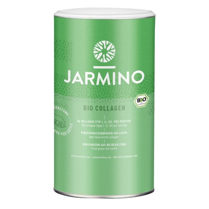Jarmino Bio Collagen е продукт, богат на основни аминокиселини, витамини и минерали, който подпомага нормалното състояние на костите, ставите и кожата. Произведен от телешки костен бульон от пасищно отглеждани животни, той е с високо качество и подкрепя имунната и храносмилателната система. Комбинацията от колаген тип I, II и III във формулата има синергично действие и спомага за кожата, костите, ставите, сухожилията. Жармино Био говежди колаген на прах не съдържа глутен, лактоза, соя, палмово масло, ГМО, пестициди, антибиотици, консерванти или добавки. Не съдържа и вредни тежки метали като арсен, олово, живак и кадмий.