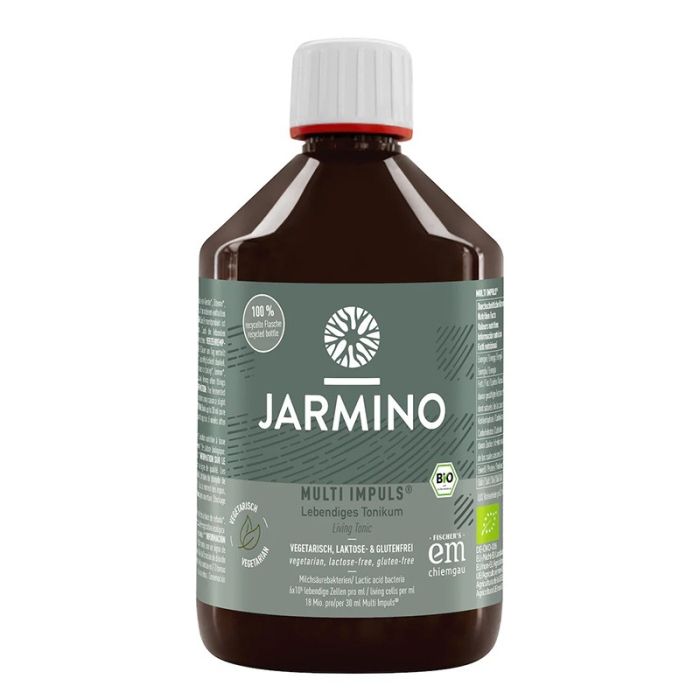 Jarmino Multi-Impuls® BIO Tonic е натурална ферментирала напитка, създадена за поддържане на здрава чревна флора и силен имунитет. Формулата комбинира овча и козя суроватка, ечемик, лайка и лимон, обогатени с 15 щама пробиотични млечнокисели бактерии. Тази органична напитка е без лактоза, глутен, ГМО и изкуствени добавки, което я прави подходяща за вегани и хора с различни хранителни нужди. Подпомага храносмилането, подобрява абсорбцията на хранителни вещества, регулира метаболизма и допринася за детоксикацията на организма. Съдържа около 80 милиарда живи пробиотици в доза от 30 мл, благодарение на процеса на каскадна ферментация, който осигурява по-голямо разнообразие от полезни бактерии в сравнение с традиционните пробиотични продукти. Жармино Био пробиотични бактерии напитка може да се приема директно или да се разрежда с вода и сок.