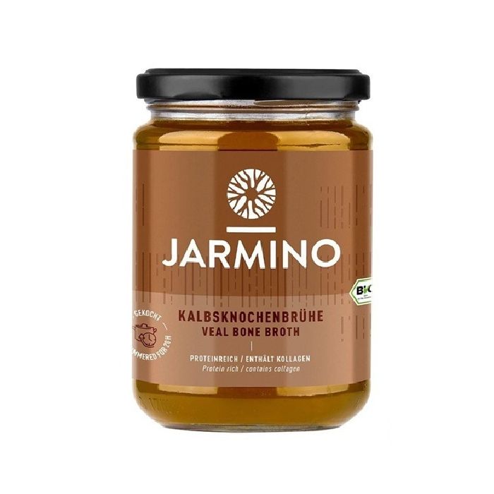 Jarmino Veal Bone Broth е вкусен и хранителен телешки бульон от кости с добавени зеленчуци, доматена паста и подправки. Произведен от пасищно отглеждани животни, както и от зеленчуци и подправки от органично земеделие, той се отличава с плътна консистенция, балансиран вкус и е богат на ценни хранителни вещества. Цялостното му действие върху организма е свързано с подкрепа за нормалното състояние на мускулите, ставите и хрущялите, както и с подобряване на храносмилането. Жармино Бульон от младо теле може да се използва като добавка към ястия или за директна консумация. За направата му са необходими 20 часа и технология, която запазва максимално ценните вещества