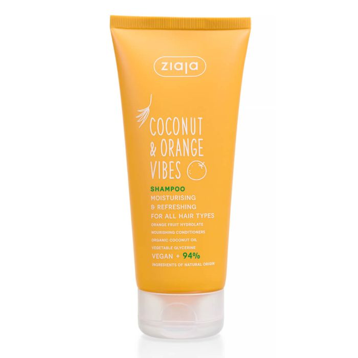 Ziaja Coconut & Orange Vibes Shampoo е шампоан за коса с вода от портокалов цвят, био кокос и растителен глицерин. Шампоанът нежно почиства скалпа и косата, като хидратира и освежава с всяко измиване. Леката му гелообразна текстура се нанася лесно и е подходяща за всеки тип коса, включително къдрава, тънка и суха. Формулата съдържа 94% съставки от естествен произход. Тя е обогатена с вода от портокалов цвят, която възвръща жизнеността и хидратира косъма. Вложеното био кокосово масло образува защитен слой и намалява уврежданията при измиване и стилизиране. То е естествен източник на есенциални мастни киселини, които овлажняват и омекотява косъма в дълбочина. Добавен е и растителен глицерин, който привлича и задържа влагата, като ефективно хидратира косата, предпазвайки я от сухота и чупливост. Жая Коконът & Ориндж Вайбс Шампоан за коса с вода от портокалов цвят, био кокос и растителен глицерин притежава деликатен аромат на бергамот и кокос, който носи енергизиращо усещане и цитрусово-тропическа свежест при всяка употреба.